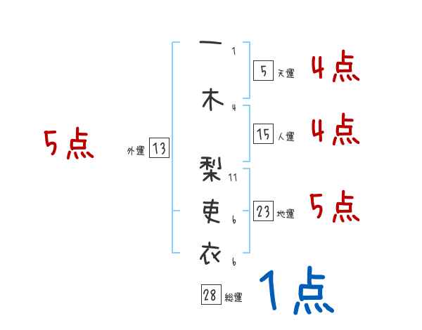 天運![]() | 一木梨吏衣さんの天運は5画の4つ星!健康で安泰。協調性に優れ、財産に恵まれる。 家系が持つ宿命的な運勢を表します。祖先から受け継いだ苗字ですので自分の力が及びません。家柄を象徴します。 |