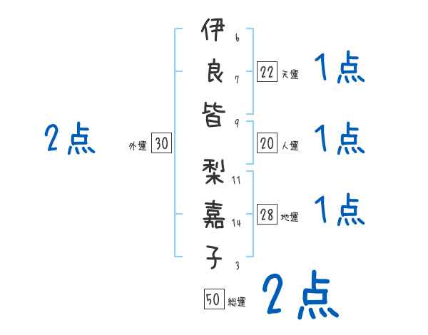 天運![]() | 伊良皆梨嘉子さんの天運は22画の1つ星!努力することが苦手ないっぽう手先が器用。芸術性にも優れる。 家系が持つ宿命的な運勢を表します。祖先から受け継いだ苗字ですので自分の力が及びません。家柄を象徴します。 |