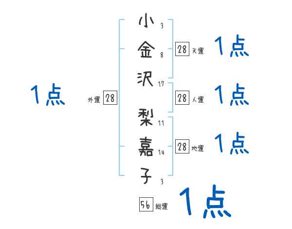 総運![]() | 小金沢梨嘉子さんの総運は56画の1つ星!消極的で無気力になりがち。誠実な気持ちが必要でしょう。 あなたの人生を表す1番重要な運勢です。生涯を通じて影響する総合運となり、主に50歳以降の晩年期に影響を及ぼします。 |