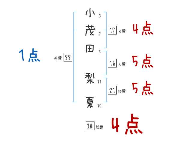 天運![]() | 小茂田梨夏さんの天運は17画の4つ星!積極的な行動力。地位を気づき財産を手に入れる。純粋な心と直感力。 家系が持つ宿命的な運勢を表します。祖先から受け継いだ苗字ですので自分の力が及びません。家柄を象徴します。 |