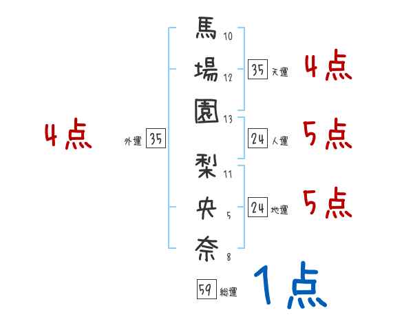 外運![]() | 馬場園梨央奈さんの外運は35画の4つ星!温厚な性格で感受性が高い。穏和な性格で人望が厚い。 生活面を象徴する運勢です。外部から受ける影響力を表し、結婚運、家庭運や職場、環境への順応性を表します。 |