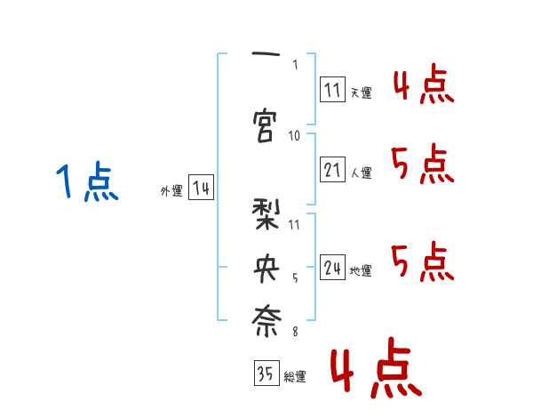 天運![]() | 一宮梨央奈さんの天運は11画の4つ星!着実に富や地位を得る幸運な人生。 家系が持つ宿命的な運勢を表します。祖先から受け継いだ苗字ですので自分の力が及びません。家柄を象徴します。 |