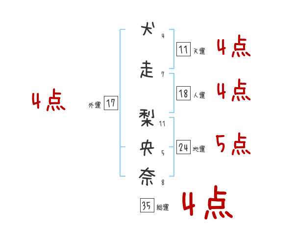 天運![]() | 犬走梨央奈さんの天運は11画の4つ星!着実に富や地位を得る幸運な人生。 家系が持つ宿命的な運勢を表します。祖先から受け継いだ苗字ですので自分の力が及びません。家柄を象徴します。 |