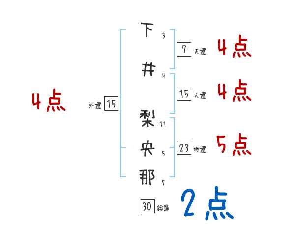 外運![]() | 下井梨央那さんの外運は15画の4つ星!人徳があり出世する。順調に物事を進め円満な人生。 生活面を象徴する運勢です。外部から受ける影響力を表し、結婚運、家庭運や職場、環境への順応性を表します。 |