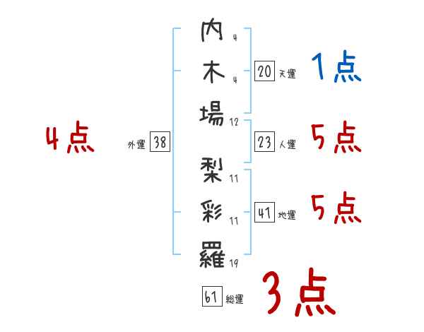 外運![]() | 内木場梨彩羅さんの外運は38画の4つ星!温厚な性格で技術的な才能を発揮する。職人的な仕事に向いている。 生活面を象徴する運勢です。外部から受ける影響力を表し、結婚運、家庭運や職場、環境への順応性を表します。 |