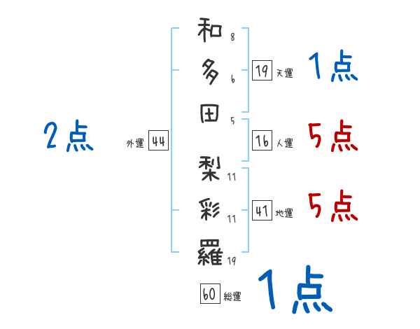 地運![]() | 和多田梨彩羅さんの地運は41画の5つ星!大志を抱き、目標に向かって実力を発揮し達成する。温和な性格。 個性を表す基礎的な運勢です。性格形成や対人関係、行動力など家庭環境に影響されます。主に誕生してから20歳くらいまでの若年期の運勢を表します。 |