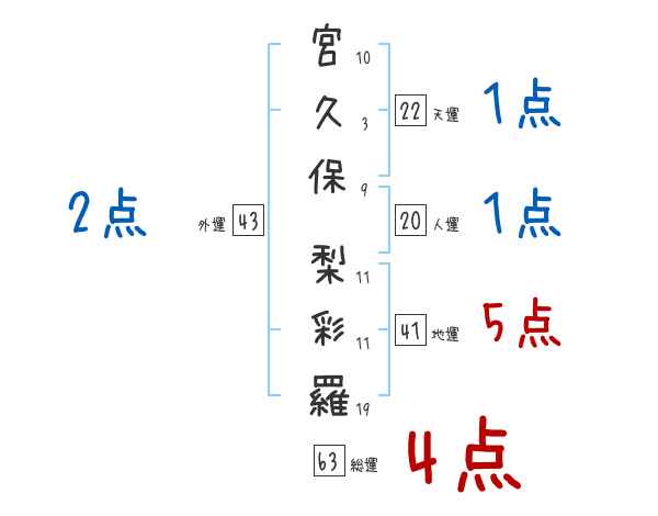 総運![]() | 宮久保梨彩羅さんの総運は63画の4つ星!家庭運がよく順調な生活。温和な性格。 あなたの人生を表す1番重要な運勢です。生涯を通じて影響する総合運となり、主に50歳以降の晩年期に影響を及ぼします。 |