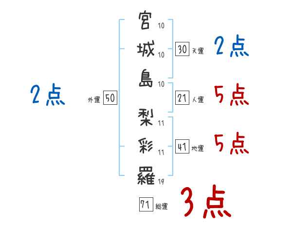 天運![]() | 宮城島梨彩羅さんの天運は30画の2つ星!浮き沈みの激しさに注意しましょう。 家系が持つ宿命的な運勢を表します。祖先から受け継いだ苗字ですので自分の力が及びません。家柄を象徴します。 |