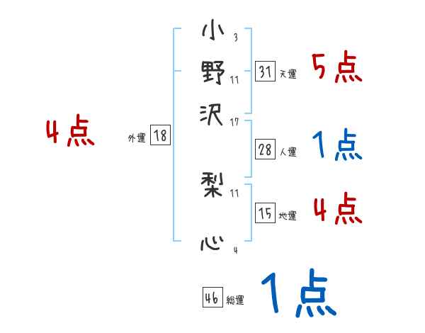 総運![]() | 小野沢梨心さんの総運は46画の1つ星!迷走することが多く苦労するかも。目先のことにとらわれないように。 あなたの人生を表す1番重要な運勢です。生涯を通じて影響する総合運となり、主に50歳以降の晩年期に影響を及ぼします。 |