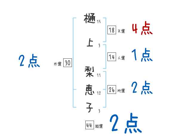 外運![]() | 樋上梨恵子さんの外運は30画の2つ星!浮き沈みの激しさに注意しましょう。 生活面を象徴する運勢です。外部から受ける影響力を表し、結婚運、家庭運や職場、環境への順応性を表します。 |