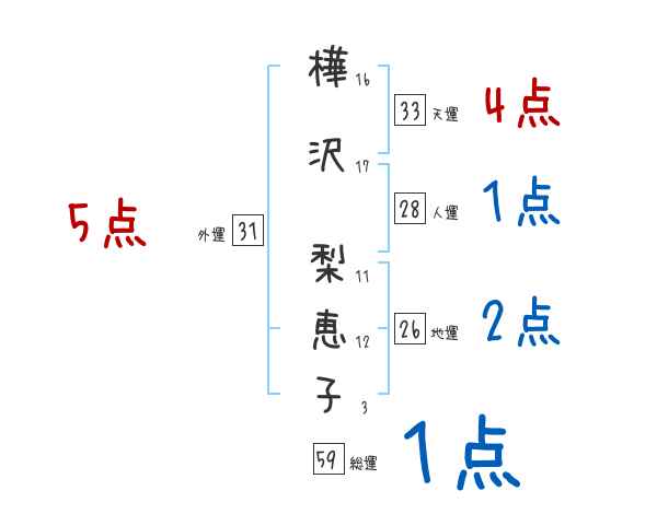天運![]() | 樺沢梨恵子さんの天運は33画の4つ星!権力志向でプライドが高い。勇気があり運を切り開き成功する。 家系が持つ宿命的な運勢を表します。祖先から受け継いだ苗字ですので自分の力が及びません。家柄を象徴します。 |