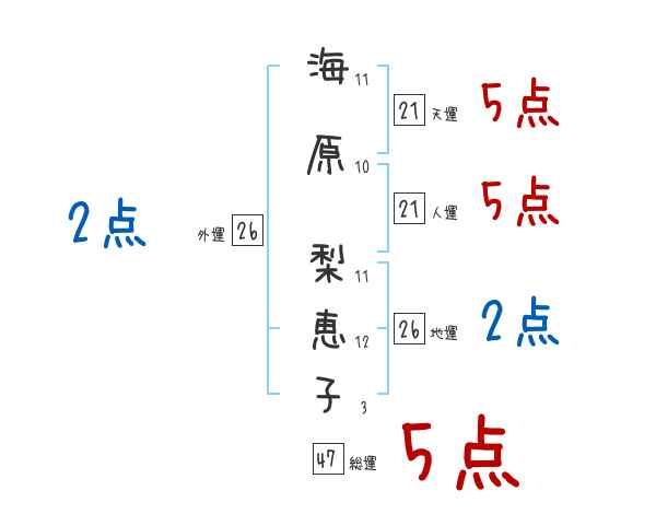 外運![]() | 海原梨恵子さんの外運は26画の2つ星!波瀾万丈かも。信頼できる人を大事にしましょう。 生活面を象徴する運勢です。外部から受ける影響力を表し、結婚運、家庭運や職場、環境への順応性を表します。 |