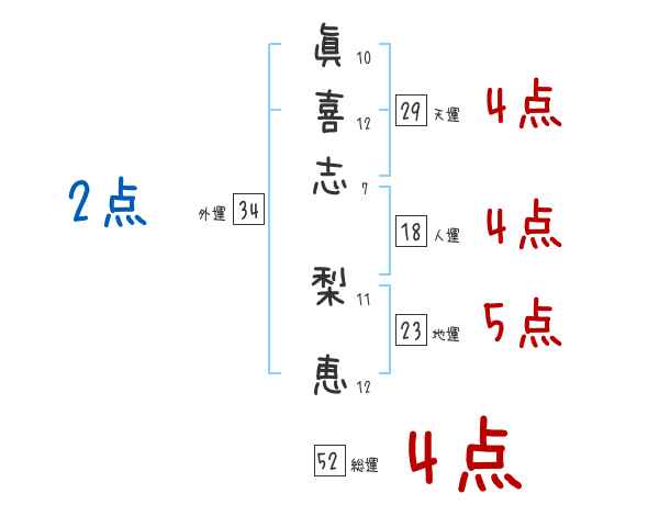 天運![]() | 眞喜志梨恵さんの天運は29画の4つ星!完全主義で才能がある。厳格な心の持ち主。 家系が持つ宿命的な運勢を表します。祖先から受け継いだ苗字ですので自分の力が及びません。家柄を象徴します。 |