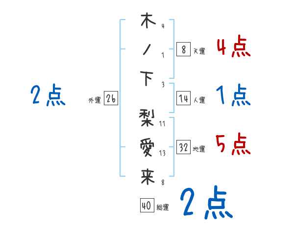 地運![]() | 木ノ下梨愛来さんの地運は32画の5つ星!柔軟性があり成功する。チャンスが多く金運が良い。 個性を表す基礎的な運勢です。性格形成や対人関係、行動力など家庭環境に影響されます。主に誕生してから20歳くらいまでの若年期の運勢を表します。 |