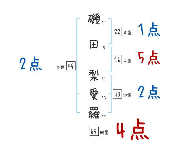 天運![]()  | 磯田梨愛羅さんの天運は22画の1つ星!努力することが苦手ないっぽう手先が器用。芸術性にも優れる。 家系が持つ宿命的な運勢を表します。祖先から受け継いだ苗字ですので自分の力が及びません。家柄を象徴します。 |