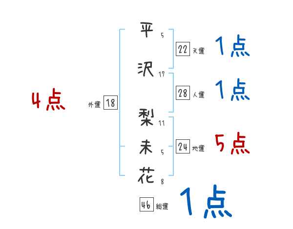 総運![]() | 平沢梨未花さんの総運は46画の1つ星!迷走することが多く苦労するかも。目先のことにとらわれないように。 あなたの人生を表す1番重要な運勢です。生涯を通じて影響する総合運となり、主に50歳以降の晩年期に影響を及ぼします。 |