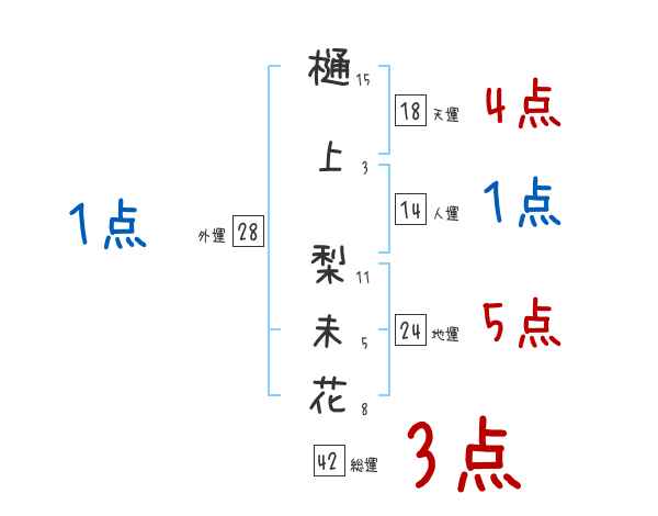 天運![]() | 樋上梨未花さんの天運は18画の4つ星!情熱的で剛気。忍耐力があり信頼される。 家系が持つ宿命的な運勢を表します。祖先から受け継いだ苗字ですので自分の力が及びません。家柄を象徴します。 |