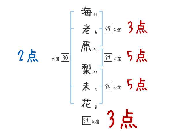 総運![]() | 海老原梨未花さんの総運は51画の3つ星!変化が激しく、危険に注意。堅実な性格。 あなたの人生を表す1番重要な運勢です。生涯を通じて影響する総合運となり、主に50歳以降の晩年期に影響を及ぼします。 |