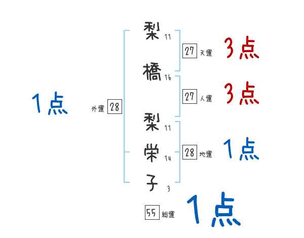 天運![]() | 梨橋梨栄子さんの天運は27画の3つ星!頭脳明晰だが強情で摩擦が多い傾向。孤立に注意。 家系が持つ宿命的な運勢を表します。祖先から受け継いだ苗字ですので自分の力が及びません。家柄を象徴します。 |