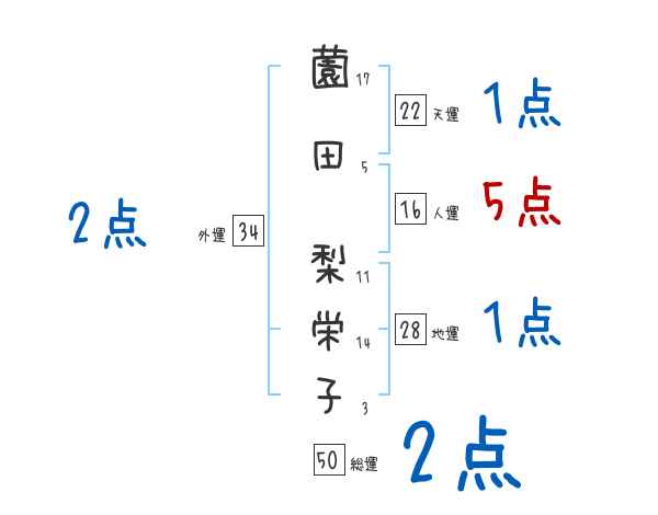 人運![]() | 薗田梨栄子さんの人運は16画の5つ星!人望が厚く大きく発展する。逆転成功が見える。 性格や才能などを表す2番目に重要な運勢です。人間関係や協調性、社会的な成功に影響します。主に20歳から50歳ぐらいまでの中年期の運勢を表します。 |