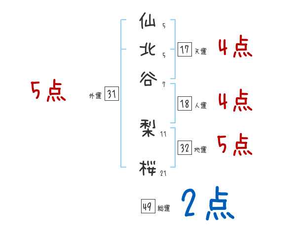 地運![]() | 仙北谷梨桜さんの地運は32画の5つ星!柔軟性があり成功する。チャンスが多く金運が良い。 個性を表す基礎的な運勢です。性格形成や対人関係、行動力など家庭環境に影響されます。主に誕生してから20歳くらいまでの若年期の運勢を表します。 |