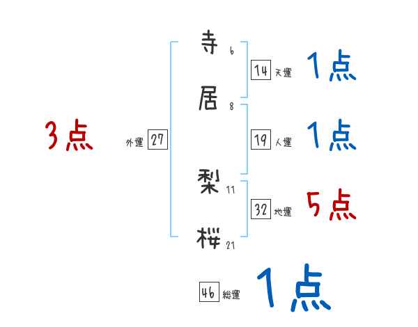 天運![]() | 寺居梨桜さんの天運は14画の1つ星!人に対して優しいがストレスを溜め込みがち。人間関係のトラブルを避けるよう気をつけましょう。 家系が持つ宿命的な運勢を表します。祖先から受け継いだ苗字ですので自分の力が及びません。家柄を象徴します。 |