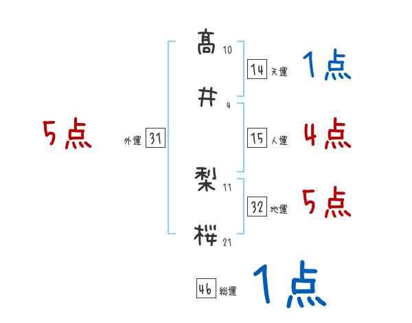天運![]() | 髙井梨桜さんの天運は14画の1つ星!人に対して優しいがストレスを溜め込みがち。人間関係のトラブルを避けるよう気をつけましょう。 家系が持つ宿命的な運勢を表します。祖先から受け継いだ苗字ですので自分の力が及びません。家柄を象徴します。 |