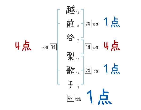 総運![]() | 越前谷梨歌子さんの総運は56画の1つ星!消極的で無気力になりがち。誠実な気持ちが必要でしょう。 あなたの人生を表す1番重要な運勢です。生涯を通じて影響する総合運となり、主に50歳以降の晩年期に影響を及ぼします。 |