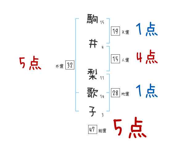 外運![]() | 駒井梨歌子さんの外運は32画の5つ星!柔軟性があり成功する。チャンスが多く金運が良い。 生活面を象徴する運勢です。外部から受ける影響力を表し、結婚運、家庭運や職場、環境への順応性を表します。 |
