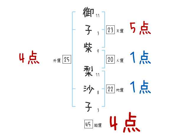 天運![]() | 御子柴梨沙子さんの天運は23画の5つ星!想像力に優れ活力がある。一代で成功し名誉を手に入れる。 家系が持つ宿命的な運勢を表します。祖先から受け継いだ苗字ですので自分の力が及びません。家柄を象徴します。 |