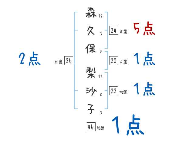 総運![]() | 森久保梨沙子さんの総運は46画の1つ星!迷走することが多く苦労するかも。目先のことにとらわれないように。 あなたの人生を表す1番重要な運勢です。生涯を通じて影響する総合運となり、主に50歳以降の晩年期に影響を及ぼします。 |