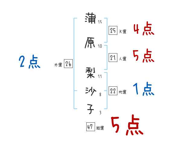 総運![]() | 蒲原梨沙子さんの総運は47画の5つ星!実力が開花し発展する円満な人生。財に恵まれる。 あなたの人生を表す1番重要な運勢です。生涯を通じて影響する総合運となり、主に50歳以降の晩年期に影響を及ぼします。 |