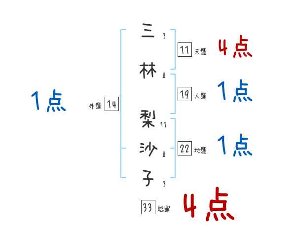 天運![]() | 三林梨沙子さんの天運は11画の4つ星!着実に富や地位を得る幸運な人生。 家系が持つ宿命的な運勢を表します。祖先から受け継いだ苗字ですので自分の力が及びません。家柄を象徴します。 |