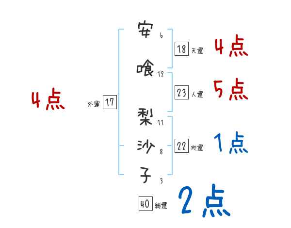 天運![]() | 安喰梨沙子さんの天運は18画の4つ星!情熱的で剛気。忍耐力があり信頼される。 家系が持つ宿命的な運勢を表します。祖先から受け継いだ苗字ですので自分の力が及びません。家柄を象徴します。 |