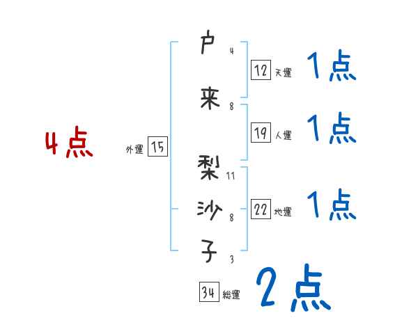 総運![]() | 戸来梨沙子さんの総運は34画の2つ星!独創性に優れるが、自尊心が強く災難に注意しましょう。 あなたの人生を表す1番重要な運勢です。生涯を通じて影響する総合運となり、主に50歳以降の晩年期に影響を及ぼします。 |