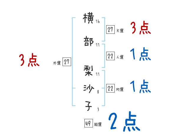 外運![]() | 横部梨沙子さんの外運は27画の3つ星!頭脳明晰だが強情で摩擦が多い傾向。孤立に注意。 生活面を象徴する運勢です。外部から受ける影響力を表し、結婚運、家庭運や職場、環境への順応性を表します。 |