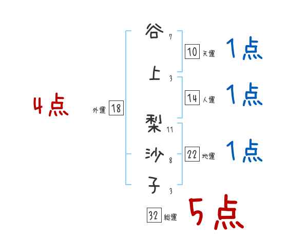 総運![]() | 谷上梨沙子さんの総運は32画の5つ星!柔軟性があり成功する。チャンスが多く金運が良い。 あなたの人生を表す1番重要な運勢です。生涯を通じて影響する総合運となり、主に50歳以降の晩年期に影響を及ぼします。 |
