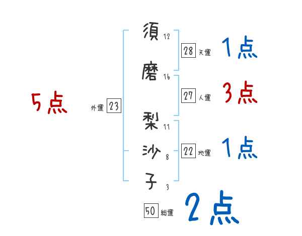 天運![]() | 須磨梨沙子さんの天運は28画の1つ星!家庭環境に注意。スポーツで活躍できる能力があるかも。 家系が持つ宿命的な運勢を表します。祖先から受け継いだ苗字ですので自分の力が及びません。家柄を象徴します。 |