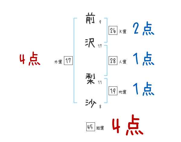 外運![]() | 前沢梨沙さんの外運は17画の4つ星!積極的な行動力。地位を気づき財産を手に入れる。純粋な心と直感力。 生活面を象徴する運勢です。外部から受ける影響力を表し、結婚運、家庭運や職場、環境への順応性を表します。 |