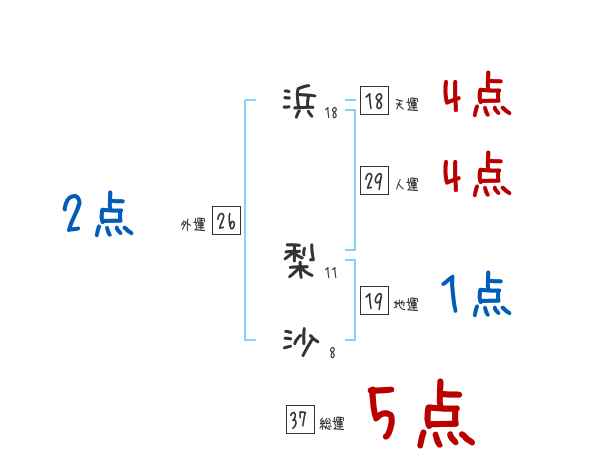 外運![]() | 浜梨沙さんの外運は26画の2つ星!波瀾万丈かも。信頼できる人を大事にしましょう。 生活面を象徴する運勢です。外部から受ける影響力を表し、結婚運、家庭運や職場、環境への順応性を表します。 |