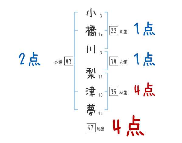 総運![]() | 小橋川梨津夢さんの総運は57画の4つ星!向上心があり人望がある。地位を得る。 あなたの人生を表す1番重要な運勢です。生涯を通じて影響する総合運となり、主に50歳以降の晩年期に影響を及ぼします。 |