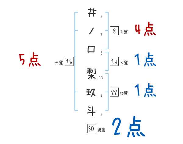 外運![]() | 井ノ口梨玖斗さんの外運は16画の5つ星!人望が厚く大きく発展する。逆転成功が見える。 生活面を象徴する運勢です。外部から受ける影響力を表し、結婚運、家庭運や職場、環境への順応性を表します。 |