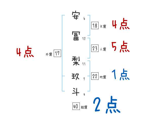 天運![]() | 安冨梨玖斗さんの天運は18画の4つ星!情熱的で剛気。忍耐力があり信頼される。 家系が持つ宿命的な運勢を表します。祖先から受け継いだ苗字ですので自分の力が及びません。家柄を象徴します。 |