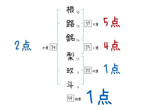 外運![]() | 根路銘梨玖斗さんの外運は34画の2つ星!独創性に優れるが、自尊心が強く災難に注意しましょう。 生活面を象徴する運勢です。外部から受ける影響力を表し、結婚運、家庭運や職場、環境への順応性を表します。 |