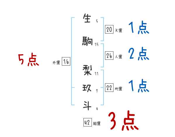 外運![]() | 生駒梨玖斗さんの外運は16画の5つ星!人望が厚く大きく発展する。逆転成功が見える。 生活面を象徴する運勢です。外部から受ける影響力を表し、結婚運、家庭運や職場、環境への順応性を表します。 |