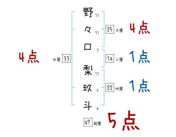 天運![]() | 野々口梨玖斗さんの天運は25画の4つ星!個性があり才能があふれる。強運の持ち主で発展する。 家系が持つ宿命的な運勢を表します。祖先から受け継いだ苗字ですので自分の力が及びません。家柄を象徴します。 |