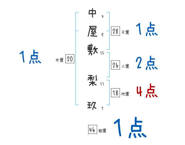 天運![]() | 中屋敷梨玖さんの天運は28画の1つ星!家庭環境に注意。スポーツで活躍できる能力があるかも。 家系が持つ宿命的な運勢を表します。祖先から受け継いだ苗字ですので自分の力が及びません。家柄を象徴します。 |