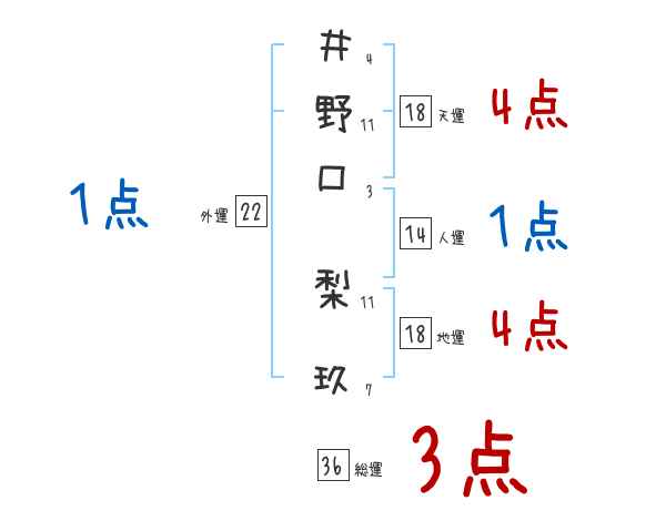 天運![]() | 井野口梨玖さんの天運は18画の4つ星!情熱的で剛気。忍耐力があり信頼される。 家系が持つ宿命的な運勢を表します。祖先から受け継いだ苗字ですので自分の力が及びません。家柄を象徴します。 |