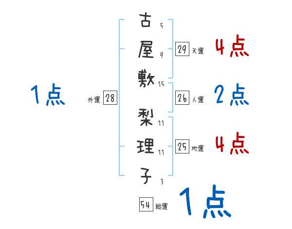 天運![]() | 古屋敷梨理子さんの天運は29画の4つ星!完全主義で才能がある。厳格な心の持ち主。 家系が持つ宿命的な運勢を表します。祖先から受け継いだ苗字ですので自分の力が及びません。家柄を象徴します。 |