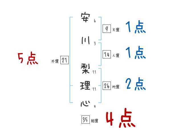 外運![]() | 安川梨理心さんの外運は21画の5つ星!統率力がある。独立し成功する。名誉を手に入れる。 生活面を象徴する運勢です。外部から受ける影響力を表し、結婚運、家庭運や職場、環境への順応性を表します。 |